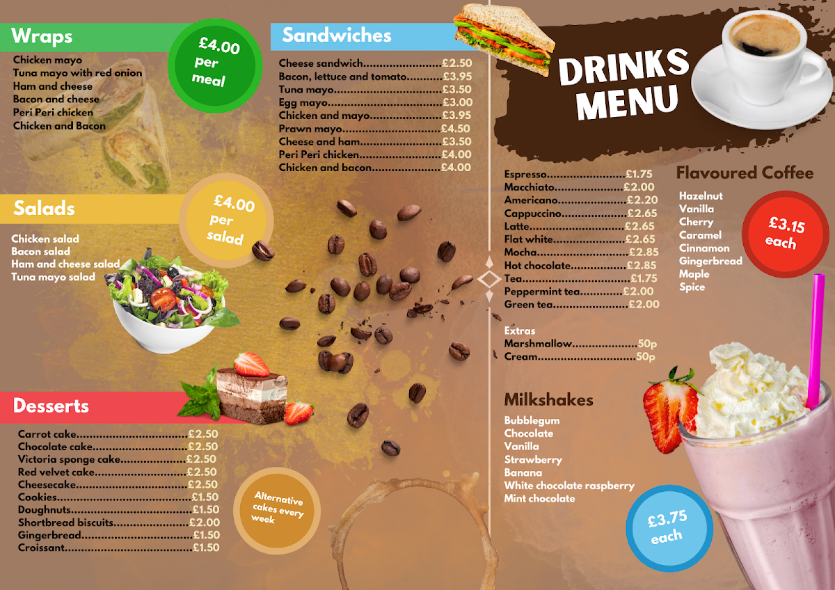 The café offers a tempting selection of menu items that cater to a variety of tastes. From delicious wraps such as the Peri Peri Chicken and Bacon and Cheese to hearty sandwiches like the classic Tuna Mayo and Chicken and Mayo, there's something for everyone. The Jacket Potatoes are a must-try as well, especially when topped with creamy cheese or zesty tuna. Each dish is prepared with care, ensuring you enjoy fresh, flavorful ingredients in every bite.